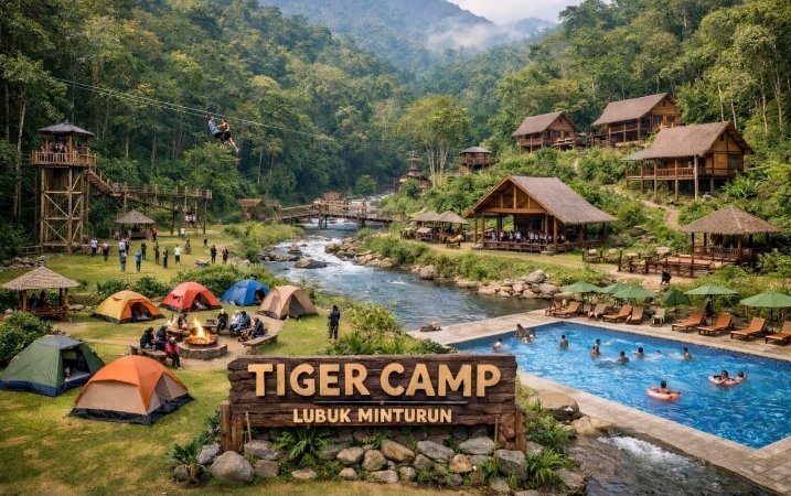 ​Gambar utama yang menyertai artikel ini memberikan gambaran visual masa depan yang menakjubkan. Gambar tersebut tidak lagi menampilkan suasana seadanya, melainkan visi sebuah resort alam yang elegan dan terorganisir. Namun kini terlihat lebih terawat dan aman, siap menyambut wisatawan ke era baru Lubuk Minturun. Di seberang sungai, area yang sebelumnya dipenuhi tenda-tenda sederhana telah berubah menjadi kompleks villa kayu bergaya bagonjong Minangkabau yang menyatu dengan indah ke dalam lereng bukit yang rimbun, lengkap dengan fasilitas glamping modern.